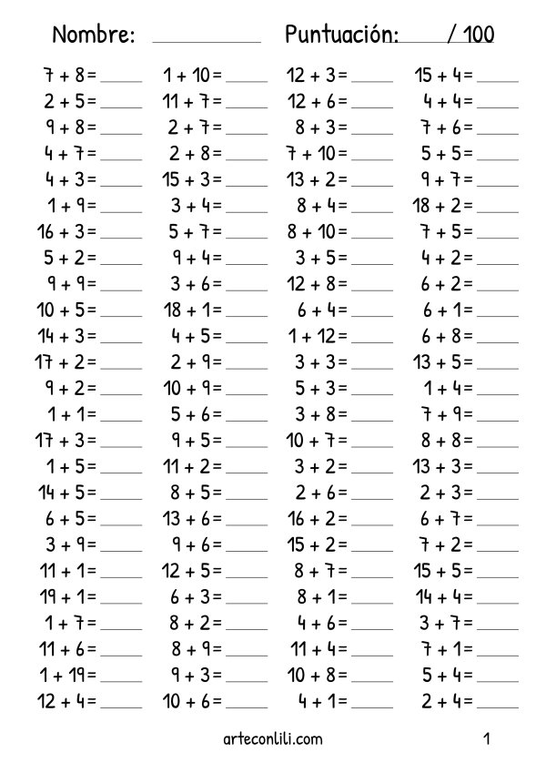 ¡Bienvenido a nuestro recurso educativo interactivo! Este imprimible de 100 sumas está diseñado específicamente para niños en edad preescolar y primaria. Con un rango de sumas que va del 1 al 19 y un resultado máximo de 20, estas hojas de trabajo son perfectas para ayudar a los pequeños a consolidar sus habilidades matemáticas de manera divertida.